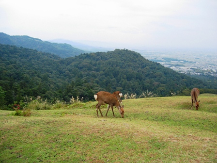 若草山山頂です。鹿もいます。すぐ向こうに見えるのは御蓋山(みかさやま)です。
