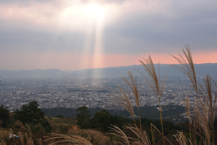 春日山の頂上と若草山の頂上とは連なっていますので、そのまま若草山へ行ける訳です。あいにく曇り空でしたが、最高の眺めです。こんな頂上にも鹿がいるんですよね。そこで、お弁当を食べました。ススキの群生があったりして、秋らしい雰囲気が出てました。途中で、変な空になり、UFOでも降りて来るのかと思いました。生駒山の向こうがまだお昼だと言うのに、夕焼けみたいに赤くなってますし、本当に奇妙な空でした。