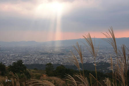 雲のすき間から太陽の光がさし、生駒山の向こうは赤くなっています。