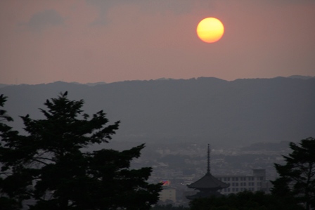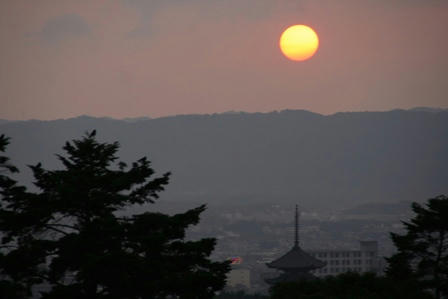 ここでちょっと写真を撮ったりして休憩をしてたら、目の前に夕日が現れたんです。もうとても綺麗で、これは何とか撮影いなくてはと二人でワイワイ言いながら、やっと写真に収める事が出来ました。ちょうど五重塔の真上に太陽が降りて来てので、五重塔を入れるのに苦労しました。