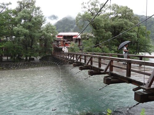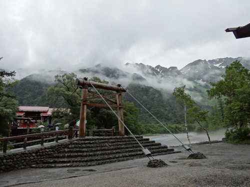 かっぱ橋越しに穂高連峰を見ます。