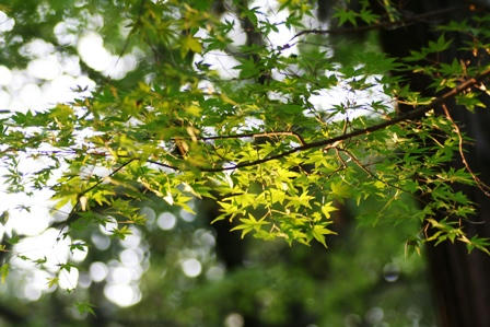木漏れ日がモミジを照らしています。(春日荷茶屋にて)
