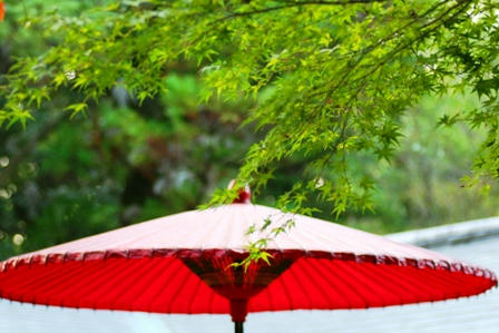 赤い番傘と緑の紅葉のマッチングがいいですねえ。お茶屋さんには番傘がよく合いますよね。