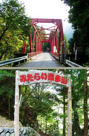 でも、何とか無事に天川川合に到着しました。みたらい渓谷は奈良県天川村にあります。もうバスを降りた途端にすでに別世界です。山に囲まれた静寂な所です。まず川迫(こうせ)川沿いに歩いて行きます。やがて、みたらい遊歩道が出て来ます。入り口に可愛い看板が立っています。そして、「天の国、木の国、川の国」と書いてありました。良く考えたら天川村の天川って「天の川」と読めますよね。素敵な名前ですよね。