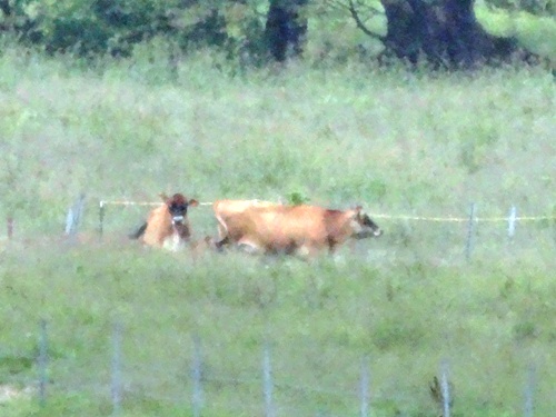 柵の向こうに2頭の牛を発見。ジャージー牛は茶色なんです。