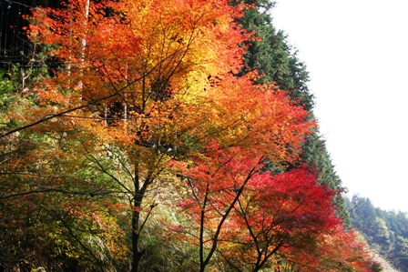 険しい山道だけでなく、途中車道沿いに歩いた所もあるんですが、そこも見事な紅葉でした。とにかく、山道も川沿いもどこも今まで見た事のないような景色ばかりでしたので、もう夢中になって、景色を眺めていました。