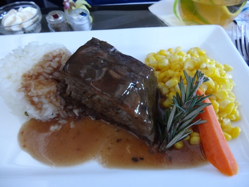 ショートリブの海鮮醤油煮、ご飯、ワイアルア産アスパラガス、コーン、ベビーキャロット(主人)