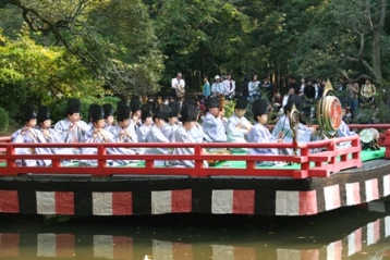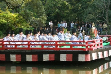 やはり、生演奏は素晴らしいです。笛だけだと単調かも知れませんが、お琴やびわや鼓なんかの音が入りますので、とても素敵な音楽になります。神苑の中ですので、別世界のような感じがしました。