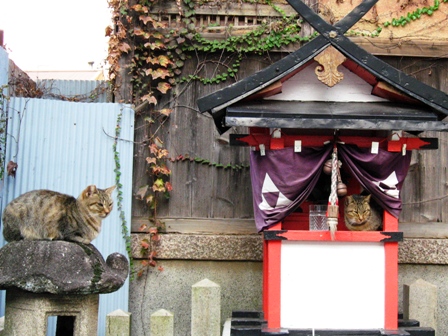 その小さなお社に猫が住み着いてるようで、いつも屋根の上に一匹お昼寝をしてます。ところが、昨日、猫が二匹いまして、一匹は燈籠の上にもう一匹は何とお社の中にいました。まるで、猫の神様の様ですね。すごく可愛かったので、娘が写真を撮ってくれました。