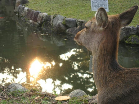 水面に映る太陽と鹿さん