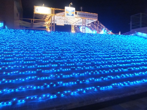 広場にでっかいペンギンさん。いつもツリーでしたが、今年はペンギンのイルミネーションです。