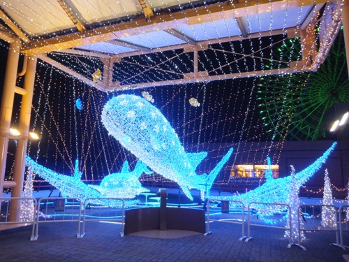 ジンベイザメのイルミネーションが入り口の前にあります。入場しないと近くで見られません。