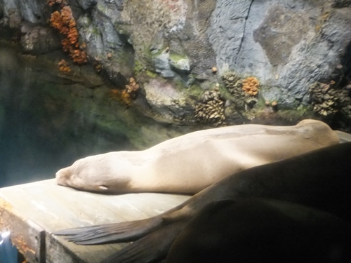 アザラシはプカプカ水面に浮かぶ板のベッドでお休み中です。