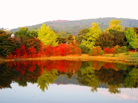 まず、大仏池です。もうナンキンハゼが真っ赤で、池の水面にも映っていて美しかったです。良く見ると若草山のてっぺんの所もちょっと赤くなっています。