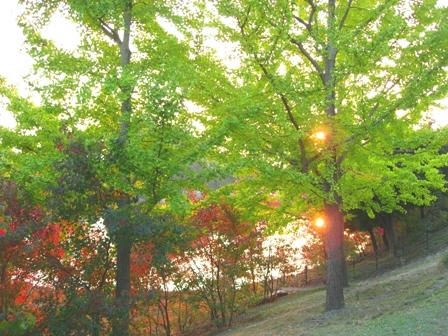 上の光が本物、下の光は水面の反射。イチョウも黄緑色です。