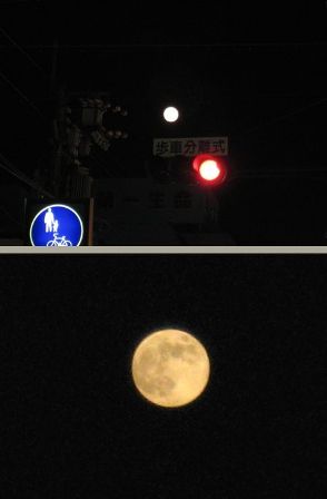 散策も終わり、スーパーでお買い物をして三条通りを歩いて帰っていたら、娘からメールがあり、「お月様がきれいよ!」と言われ、後ろを振り向いたら、綺麗な満月でした。お月様の見える反対方向に歩いていたので、全く気付きませんでした。三条通りからなので、ロケーションは良くありませんが、とりあえず、お月様の写真を撮って帰りました。