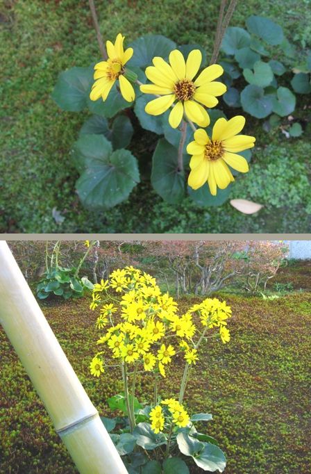 「つわぶき」と言う黄色い菊科の花があります。葉っぱがちょっとゼラニウムみたいなんですが。写真で見たら普通の菊と言う感じなんですが、この時期見れるお花は限られていますので、このつわぶきを見に京都の