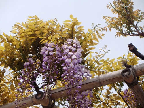 浮雲園地の藤棚を見てびっくり。かなり藤が咲き始めています。