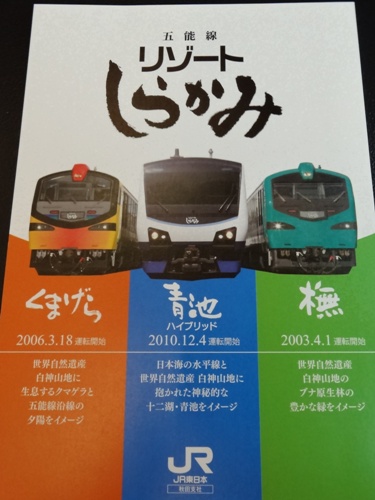リゾートしらかみは、車両が3種類あります。青は青池、オレンジはくまげら、緑は橅(ぶな)です。