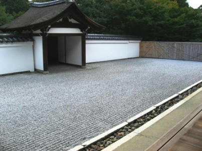 「龍の庭」黒雲、白雲と躍動感があります。竹垣は稲妻を表してます。