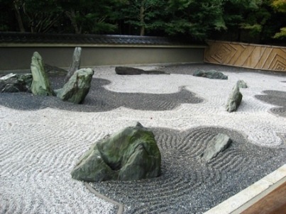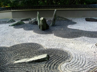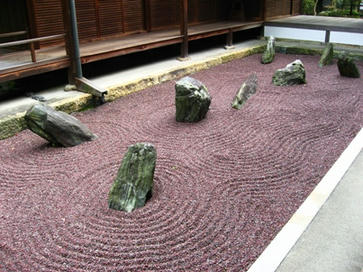 「不離の庭」です。横長の岩が国師で、両脇が犬、その周りが狼です。