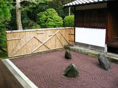 「不離の庭」赤砂が綺麗です。竹垣は山を表しています。