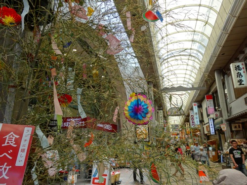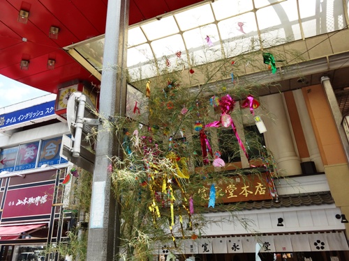 すぐ目の前に東向き商店街があります。七夕の笹が飾ってあります。