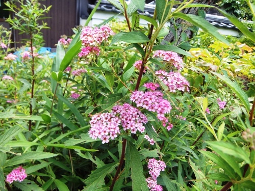 元興寺塔跡 ピンクのシモツケがまだ咲いていました。