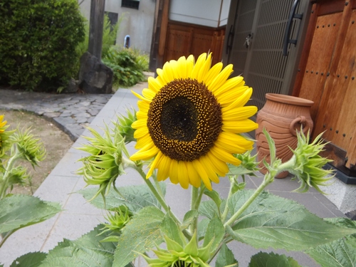 元興寺塔跡 可愛い背の低いひまわりが咲きだしていました。