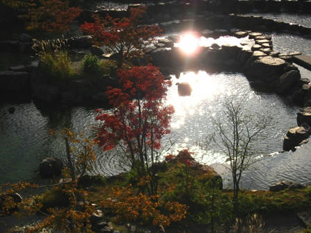 そして、今度は下に降りて実際にもみじ谷の中を散策しました。もう最高です。モミジの紅葉も綺麗ですし、本当に名前通りに谷になってますので、岩礁があったり、小さい滝が一杯あるのです。小川があり、池があり、そして、ツワブキが一杯咲いていました。モミジの赤と木々の緑と滝の水しぶきの白とそしてツワブキの黄色が混じってとても幻想的な世界でした。