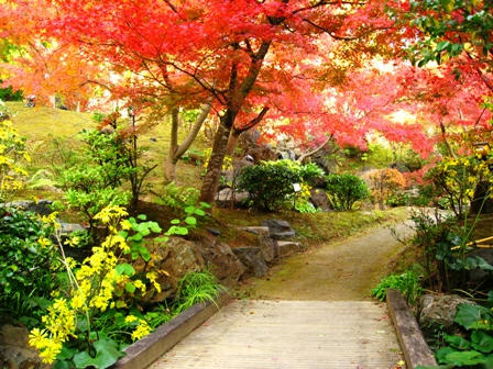 モミジの赤とツワブキの黄色と草木の緑が鮮やかです。