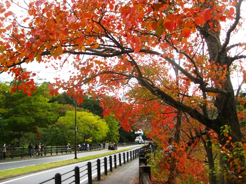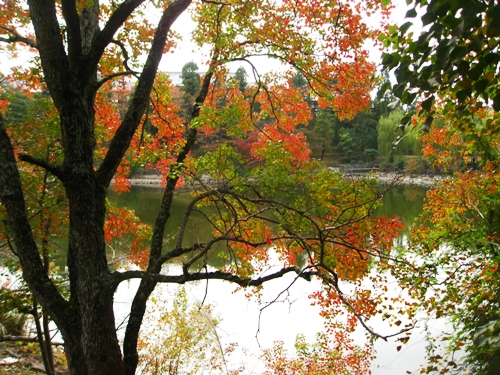 荒池の橋の上から ここら辺はナンキンハゼの紅葉が一杯見られます。