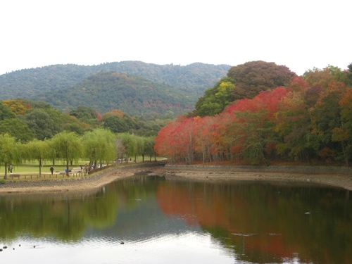 荒池とナンキンハゼの紅葉 向うに御蓋山と春日山が見えます。