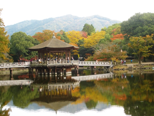 鷺池に来ました。浮見堂と色とりどりの紅葉と黄葉
