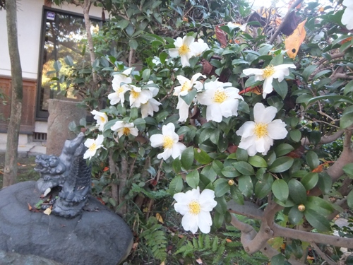 同じく元興寺塔跡で。白いサザンカがたくさん咲いています。