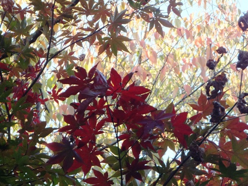 元興寺塔跡の本堂前に紅葉したカエデが少しだけありました。