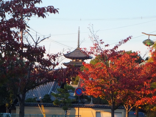 桜の紅葉と興福寺の五重塔 夕陽が当たって真っ赤です。