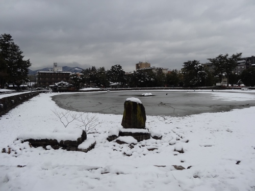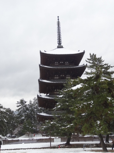 猿沢池です。水面は凍ってるようですね。その氷の上にさらに雪が積もってます。
