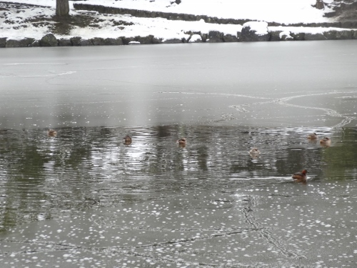 鷺池の水面は凍ってないのか、カモの赤ちゃんがたくさん泳いでいます。