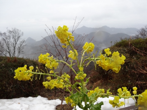 頂上には、雪が一杯残っています。菜の花も寒そう。