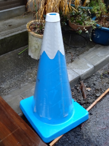 赤い三角コーンが、こちらでは、水色です。