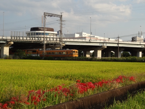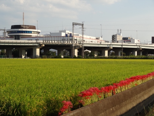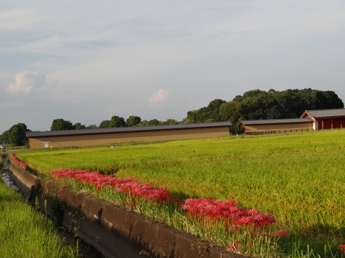 田んぼ沿いに彼岸花がズラリと並んで咲いています。