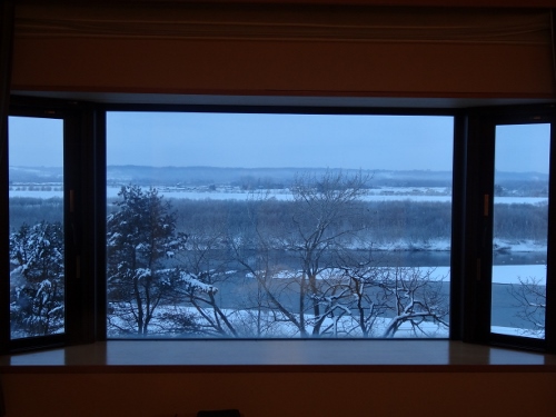 観月苑のお部屋は、出窓になっていて、十勝川が目の前に見え、まるで額縁絵の様です。