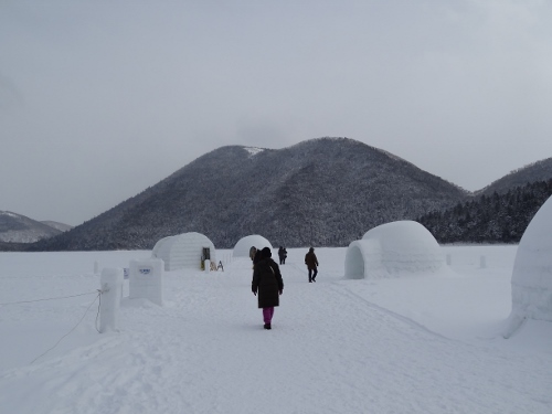 然別湖の上を歩いています。湖の上とは思えないですね。鎌倉が一杯あります。