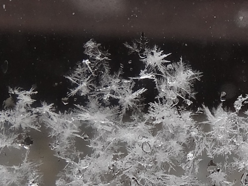 バスに乗ると窓ガラスに雪が積もって凍っていたのですが、雪の結晶が見られました。