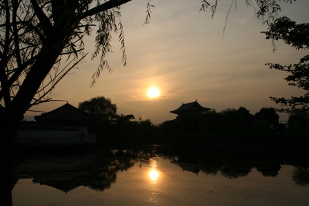 夕日が池に映っているのが素敵です。