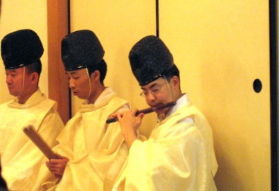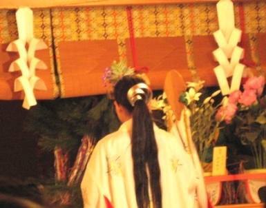 お供え物をしたり、笛の音に合わせて、巫女さんが舞ったり、