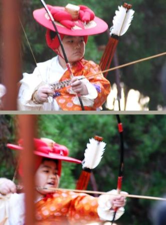 稚児流鏑馬の矢を射る前の緊張した顔と