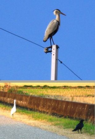 電柱の上のアオサギ君と白鷺とカラスの2ショットです。