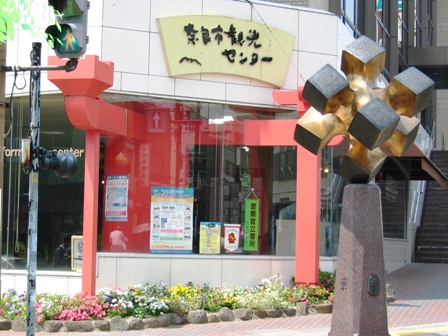 三条通りの真ん中に奈良市観光センターがあります。初めて気が付いたのですが、ガラスを突き抜けて、鳥居になってるんですね。多分そういうデザインだと思います。でも、その前のオブジェが良く分かりません・・・。